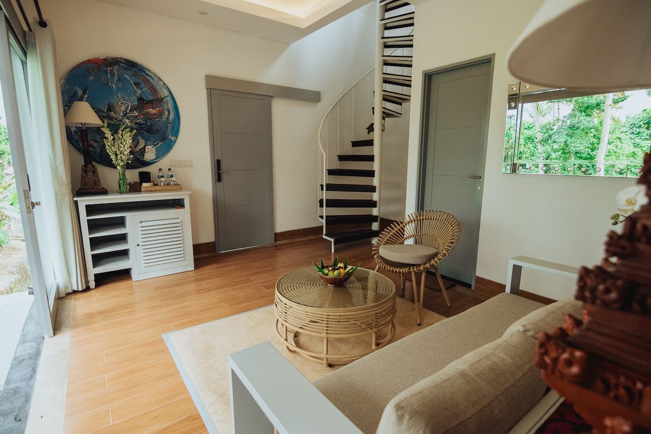 Incorporating modern and Balinese architecture design, the villa is inspired by the Traditional rice barn called ‘the lumbung’ which firmly built with the calming wood element. The living room on the ground level is adapting an open living concept completed where the plunge pool and long river pool is attached to its terrace, while on the upstairs, the bedroom is perfectly set in the wooden curved roof with the balcony allowing more privacy. There are 8 units one-bedrooms in total at Tanamas
